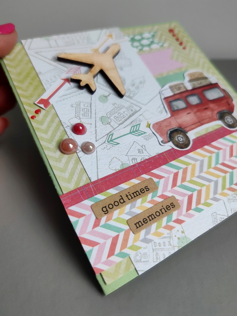 Ręcznie wykonana i jedyna w swoim rodzaju kartka okolicznościowa. Dla kogoś, kto uwielbia podróże, i te małe i te duże. Kolory które dominują to zieleń, czerwień i biel.