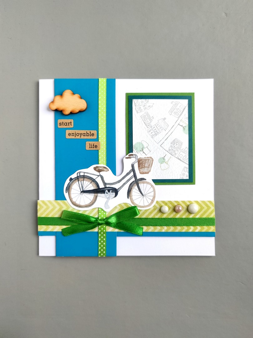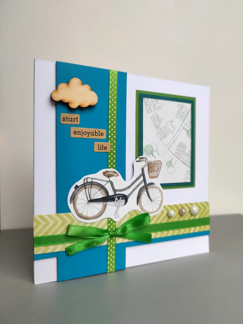 Ręcznie wykonana i jedyna w swoim rodzaju kartka okolicznościowa. Dla kogoś, kto uwielbia rowerowe przygody. Kolory które dominują to zieleń, turkus i biel.
