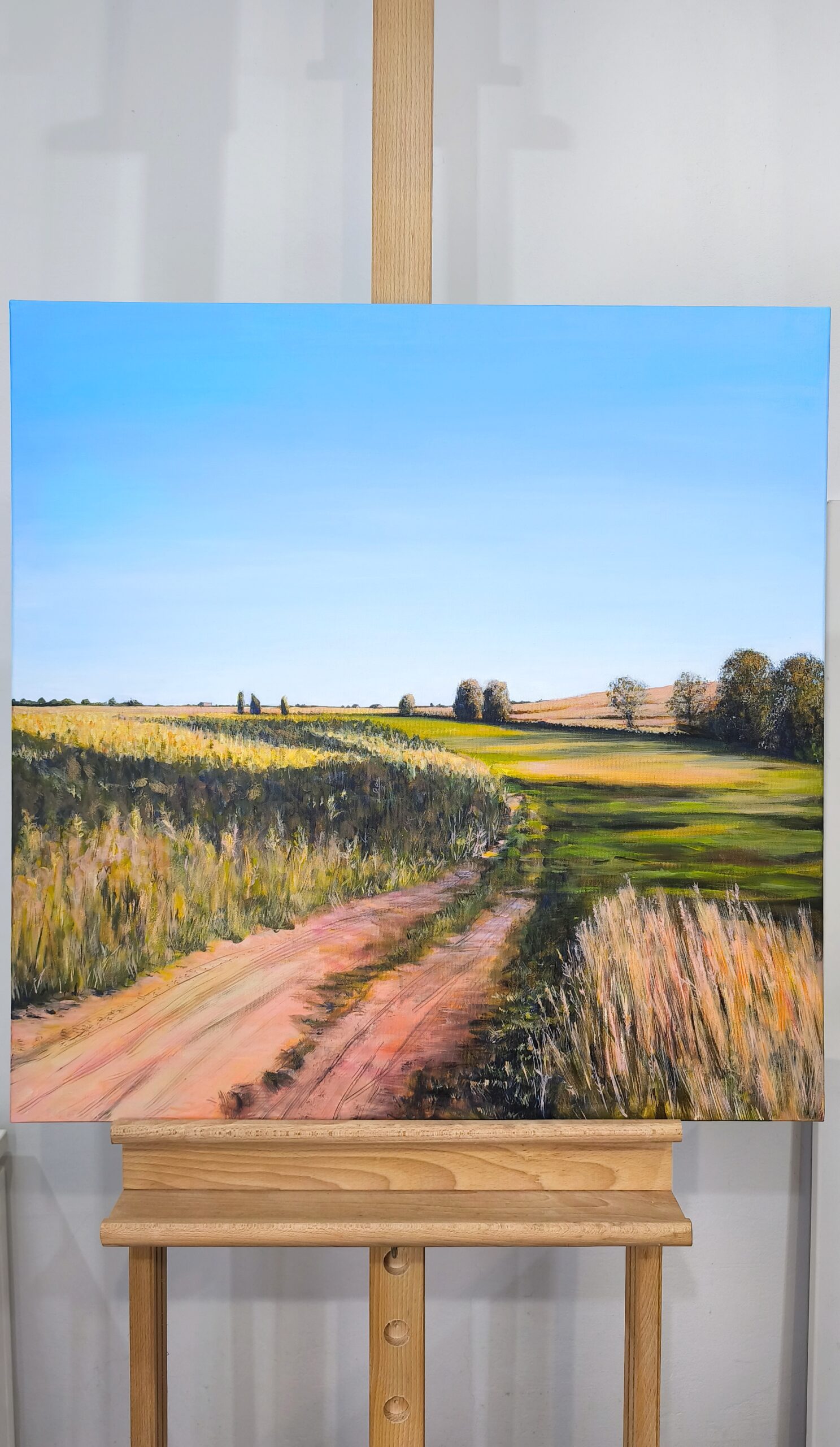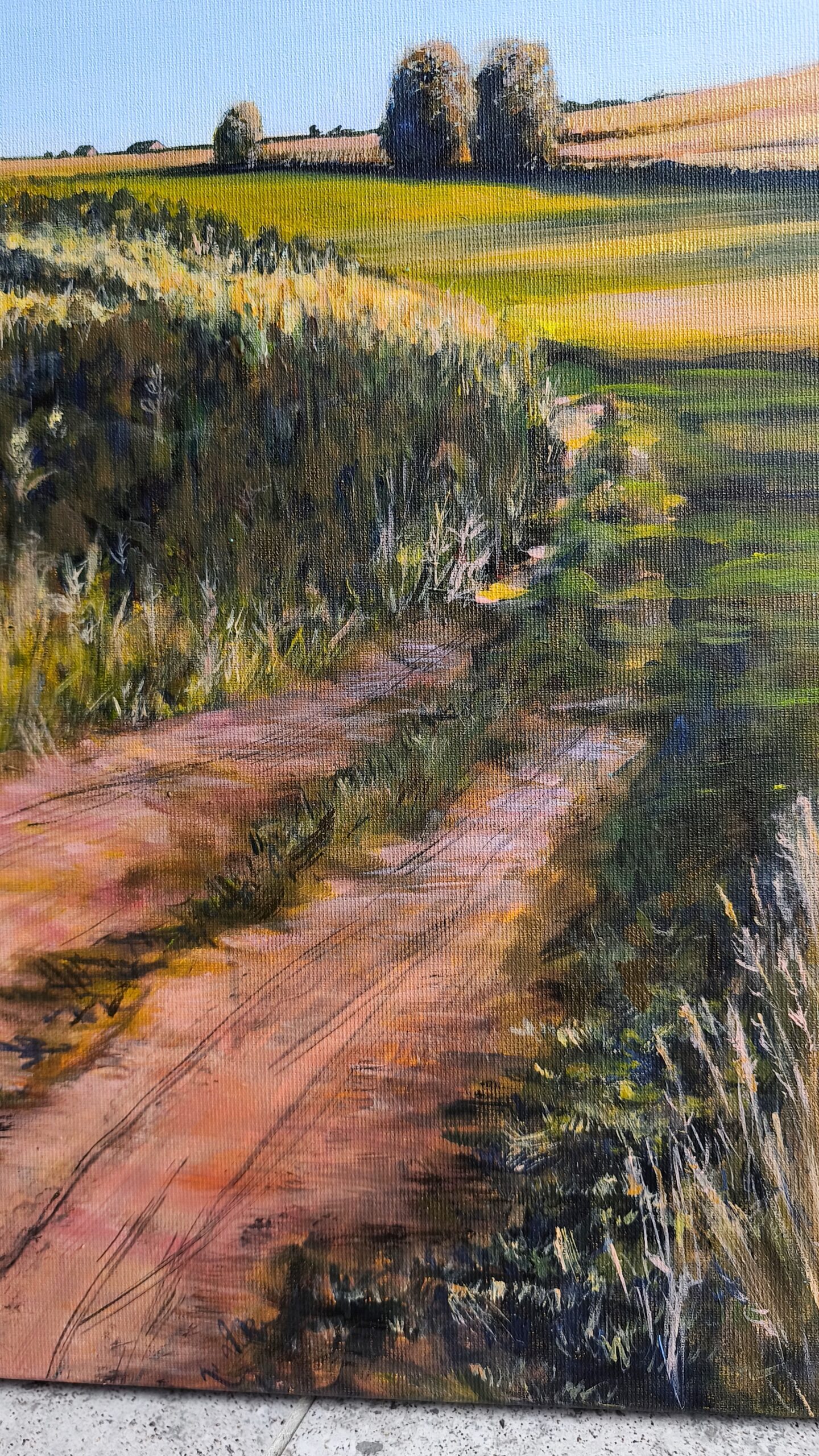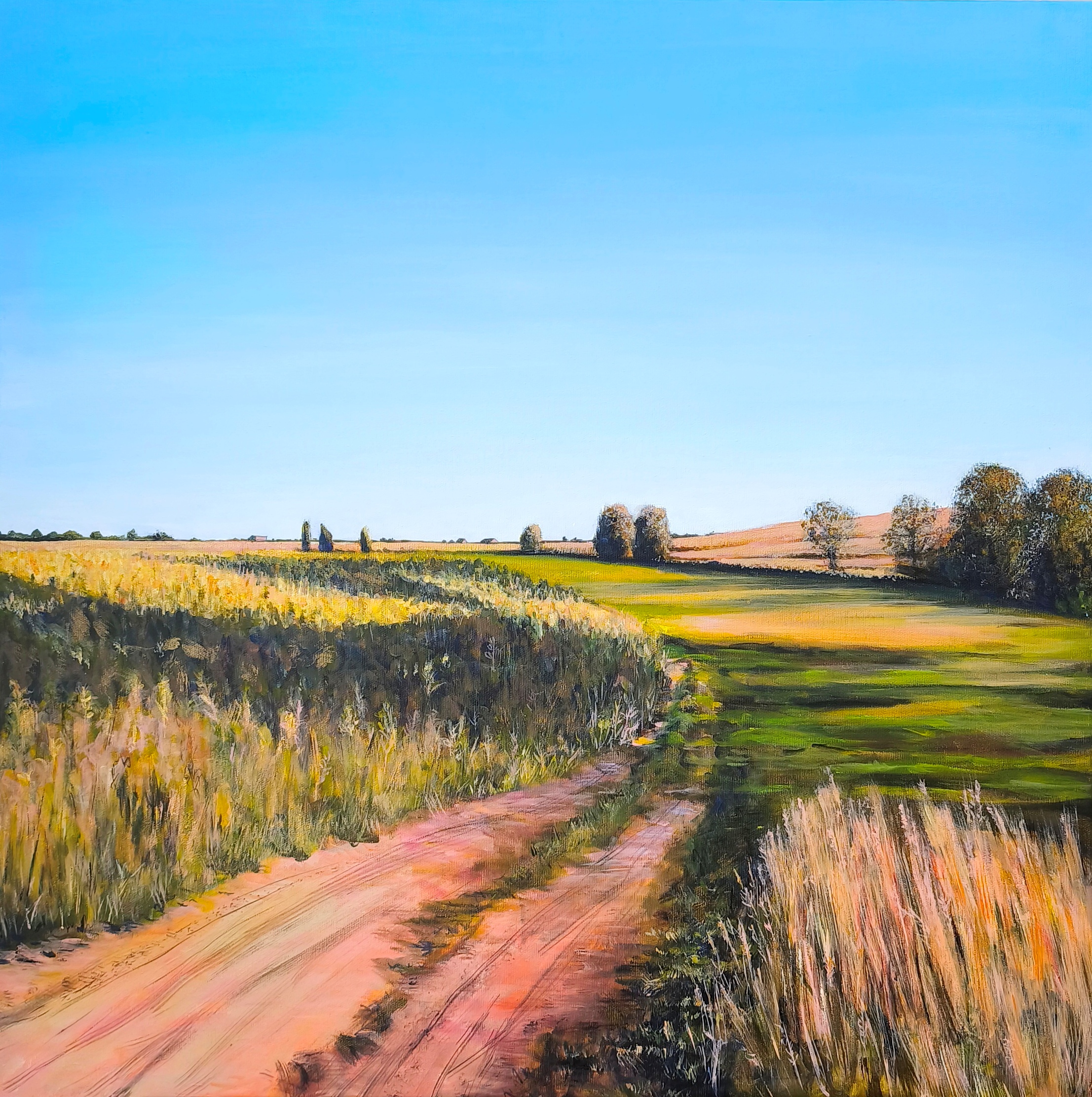 Kolorowy pejzaż przedstawiający wiejski krajobraz. Widzimy bujną zieleń, pola, łąkę, ciepłe promienie słońca przenikające przez gałęzie drzew. Są takie miejsca, które przywołują wspomnienia. Jak słoneczne letnie popołudnie na wsi. Błękit nieba, ciepłe brązy, złote refleksy i różne odcienie zieleni. Metaliczna farba położona w subtelny sposób daje wrażenie trójwymiarowości.