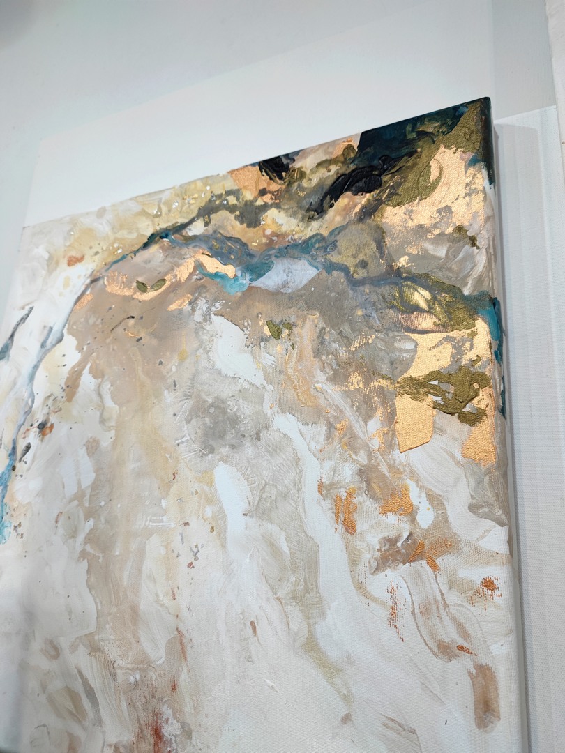 Abstrakcyjna kompozycja łącząca w sobie odcienie bieli i beży przeplatających się z mocniejszymi akcentami czerni, miedzi i granatu. Świetnie sprawdzi się w nowoczesnym wnętrzu i stanowi ciekawy element wystroju. Obraz namalowałam na podkładzie o grubości 3cm, dzięki czemu robi wrażenie zarówno oprawiony w ramę jak i bez niej.