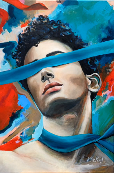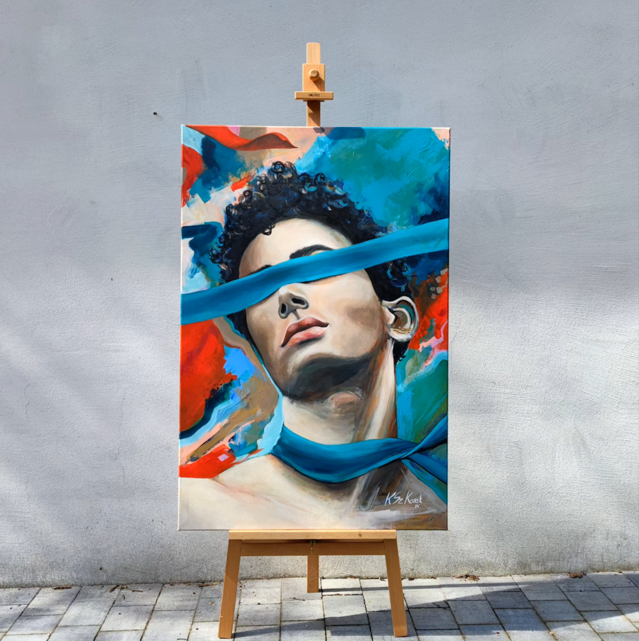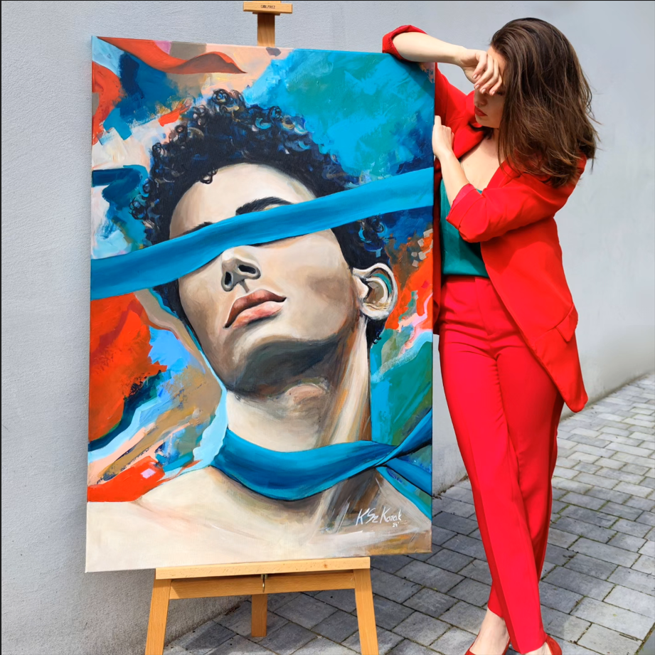 Czy miewacie czasem „Déjà vu”? Może wzrok nam płata figle a może faktycznie widzimy to samo kolejny raz? Intrygująca męska postać w otoczeniu kontrastujących barw zdecydowanie przykuwa uwagę. Mocne połączenie kolorystyczne czerwieni  z klimatyczną morską zielenią stanowi energetyczny duet. Duży format potęguje efekt i z pewnością będzie świetnie nadawał się do nowoczesnego wnętrza. Unikatowy obraz dla interesującej przestrzeni z charakterem.