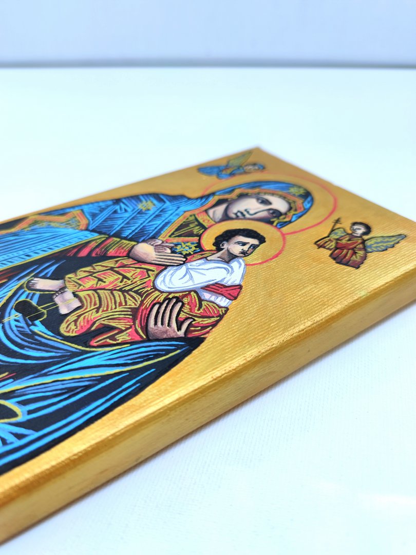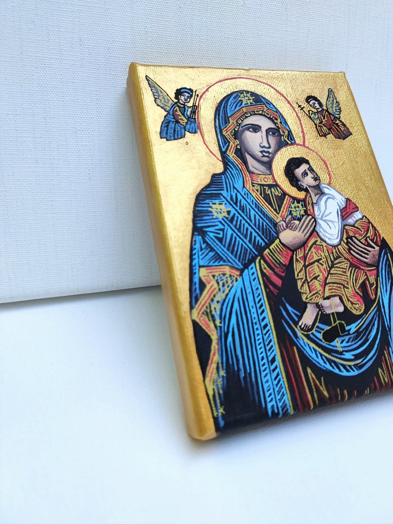 Starannie namalowana Ikona ukazująca Matkę Bożą Nieustającej Pomocy. Wykonałam ją na zamówienie używając specjalnej techniki na płótnie. Zdobienia malowałam złotą farbą, starając się dokładnie odwzorować oryginał. Obraz Matki Bożej Nieustającej Pomocy przedstawia cztery święte postacie: Dziewicę Maryję, Dzieciątko Jezus oraz świętych archaniołów: Gabriela i Michała. Stworzony został z najwyższą starannością i dbałością o szczegóły. Wspaniale sprawdzi się jako upominek dla bliskiej nam osoby.