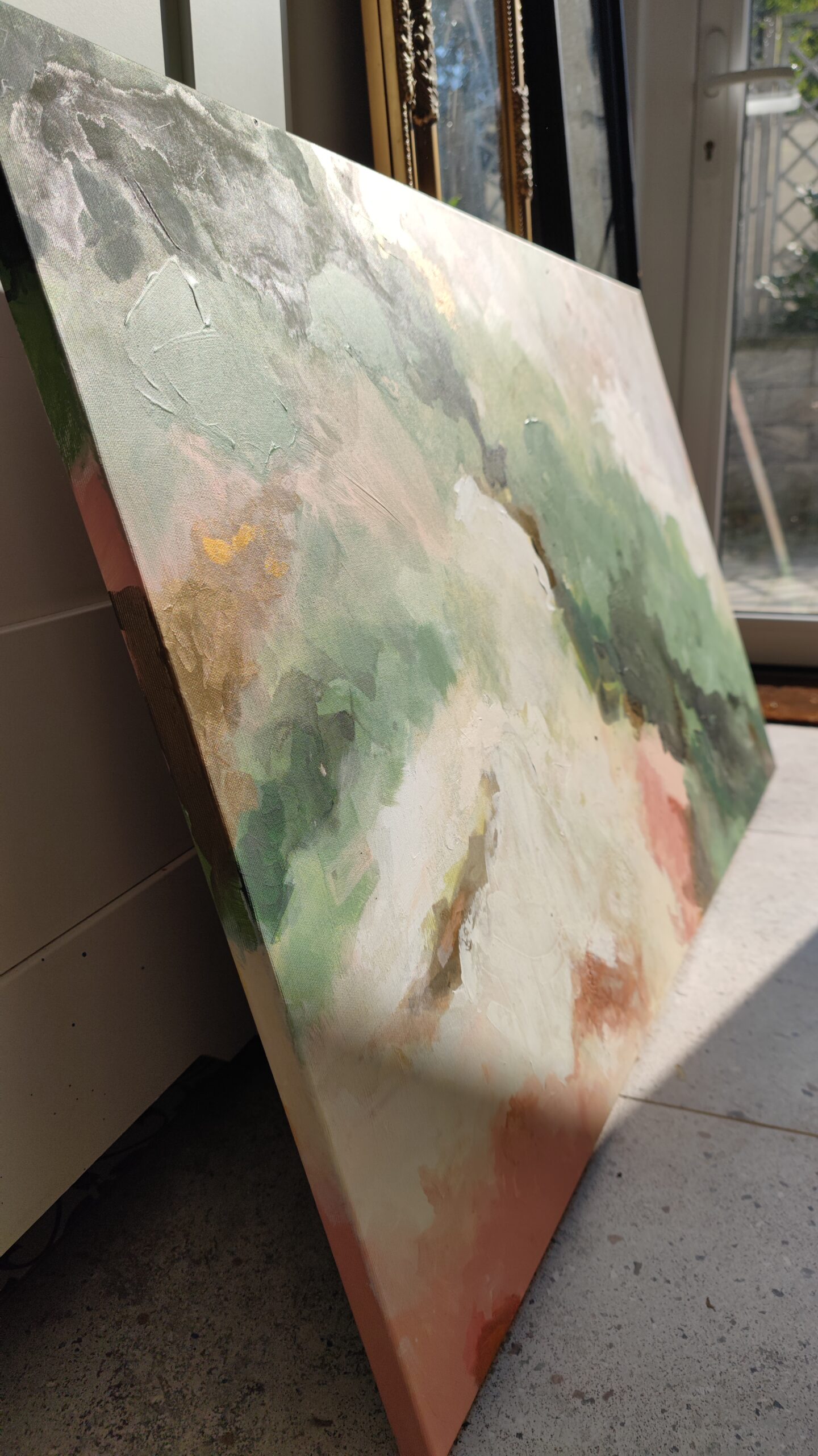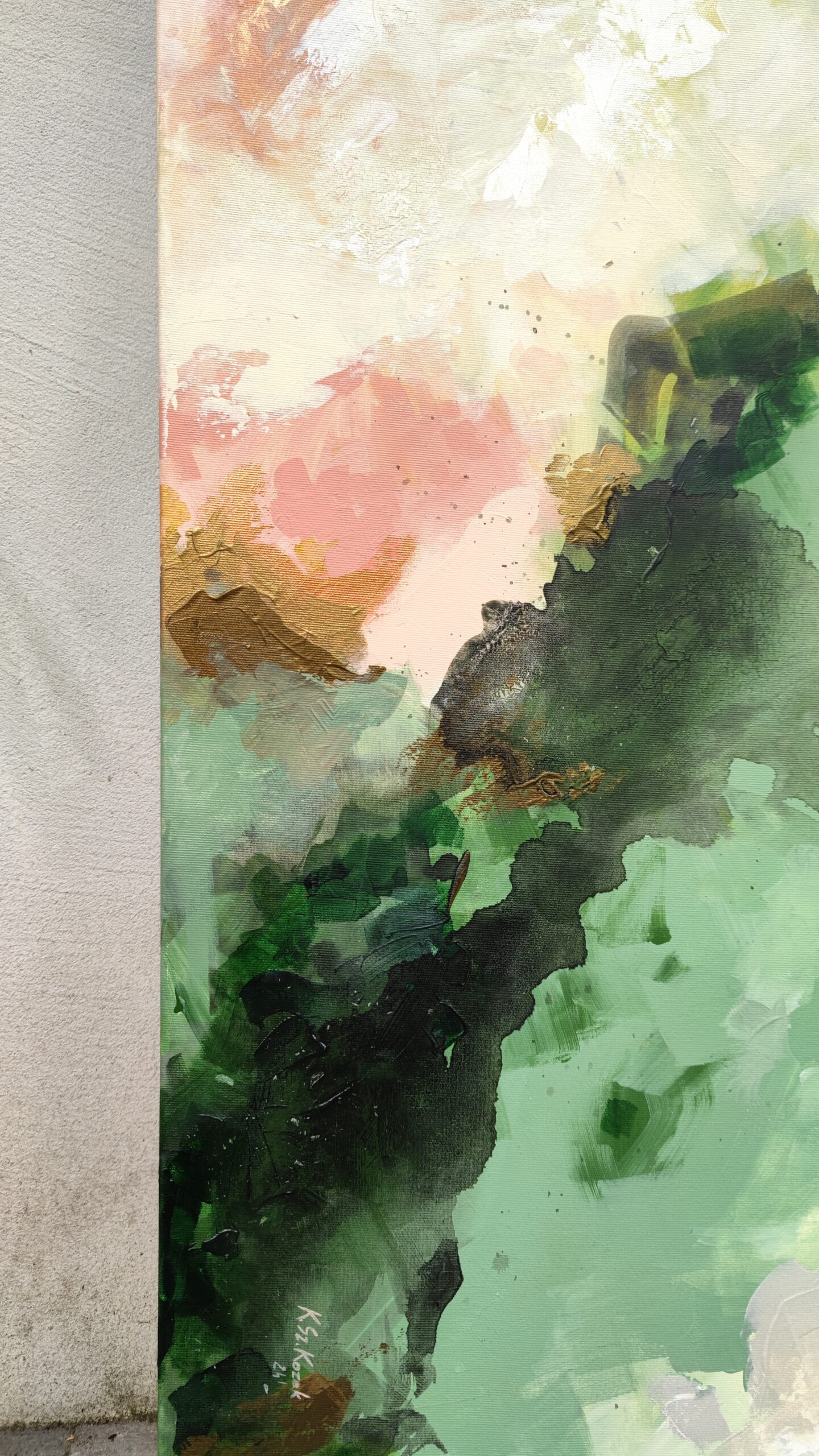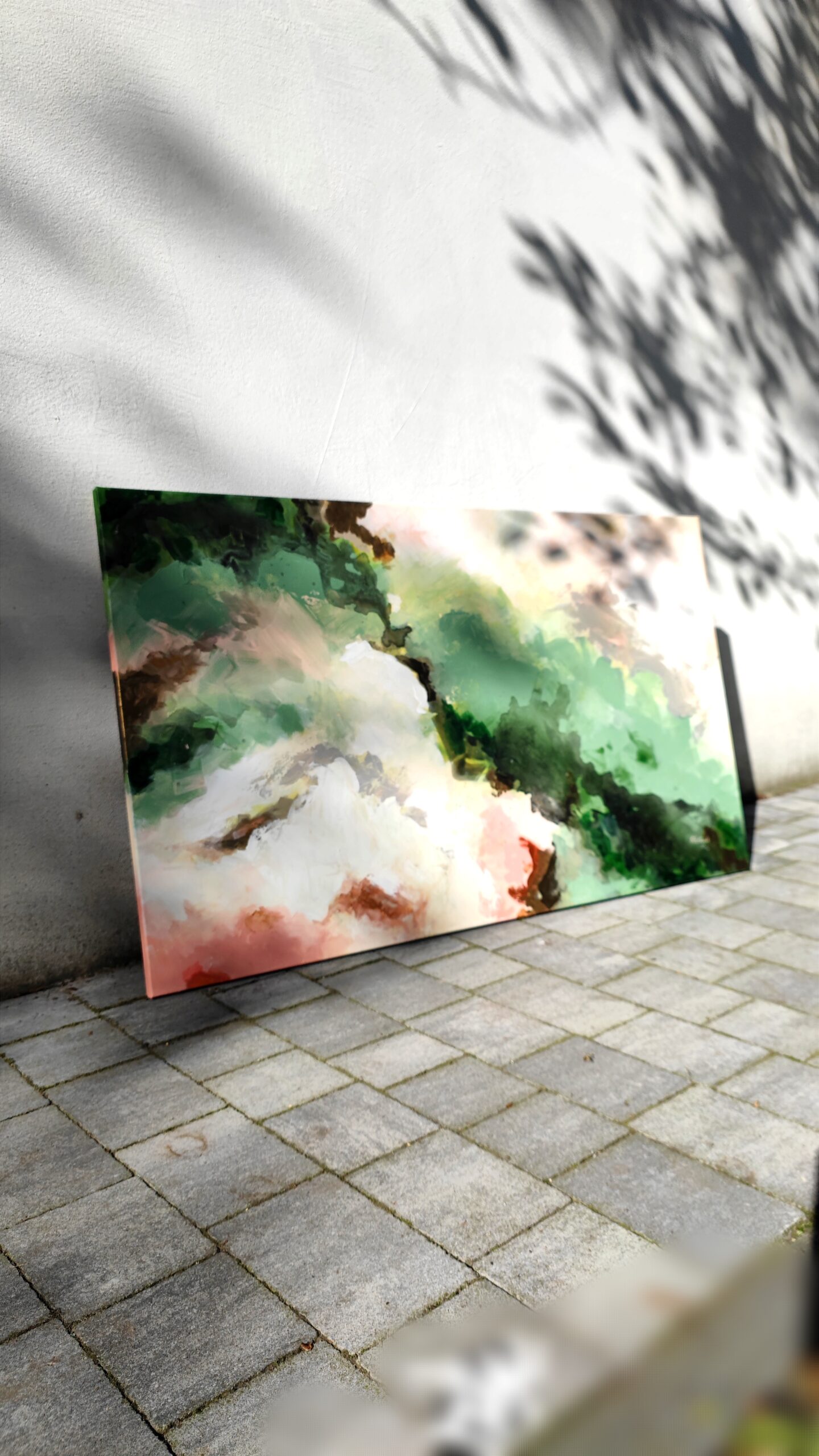 Piękna harmonijna kompozycja składająca się z odcieni zieleni, różu, bieli i ecru przepleciona złocistymi refleksami. Abstrakcja ta wprowadza przyjemny akcent kolorystyczny. Wygląd obrazu zmienia się w zależności od światła i miejsca z którego go podziwiamy. Świetnie będzie się prezentować zarówno w pionie jak i poziomie. Unikatowy obraz dla interesującej przestrzeni.