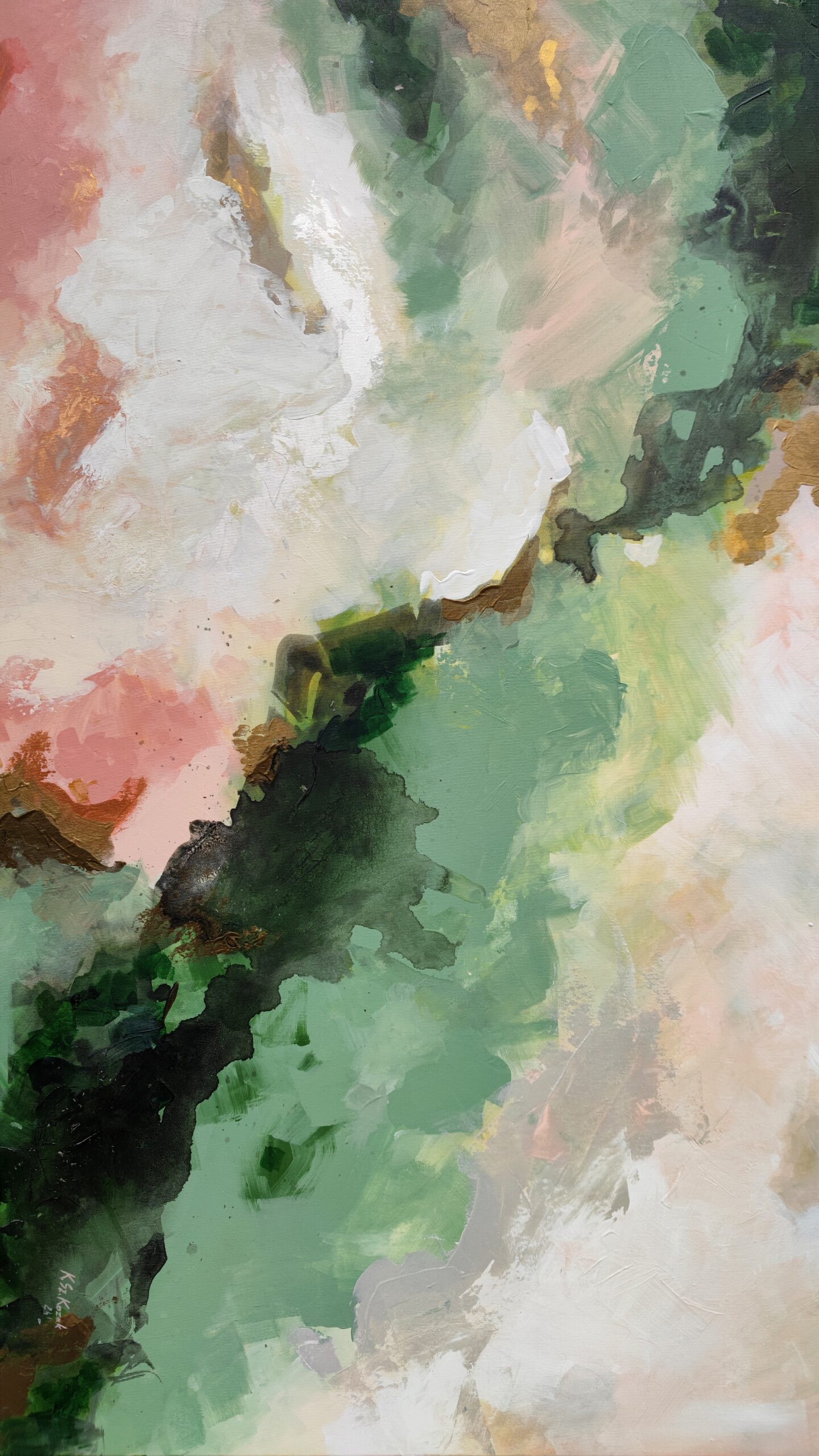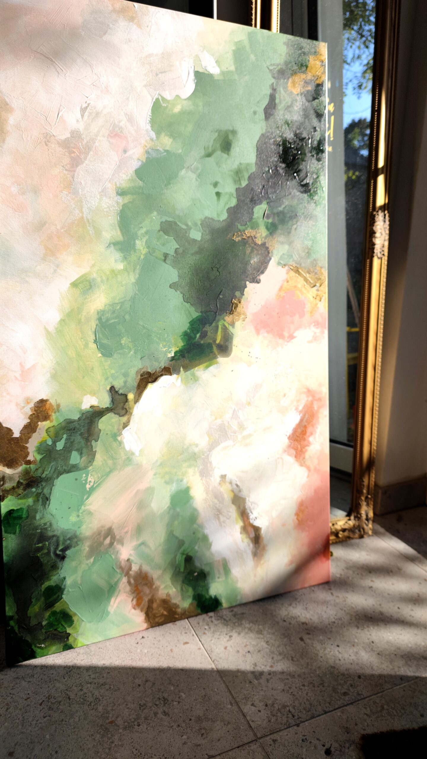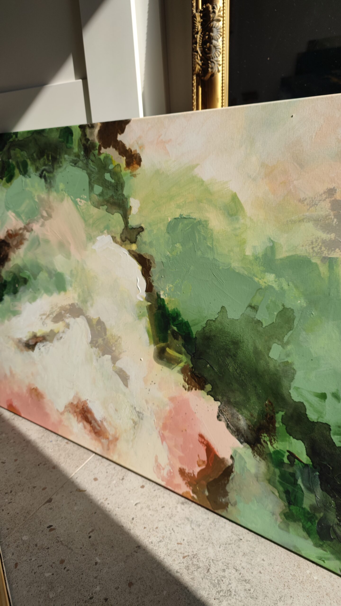 Piękna harmonijna kompozycja składająca się z odcieni zieleni, różu, bieli i ecru przepleciona złocistymi refleksami. Abstrakcja ta wprowadza przyjemny akcent kolorystyczny. Wygląd obrazu zmienia się w zależności od światła i miejsca z którego go podziwiamy. Świetnie będzie się prezentować zarówno w pionie jak i poziomie. Unikatowy obraz dla interesującej przestrzeni.