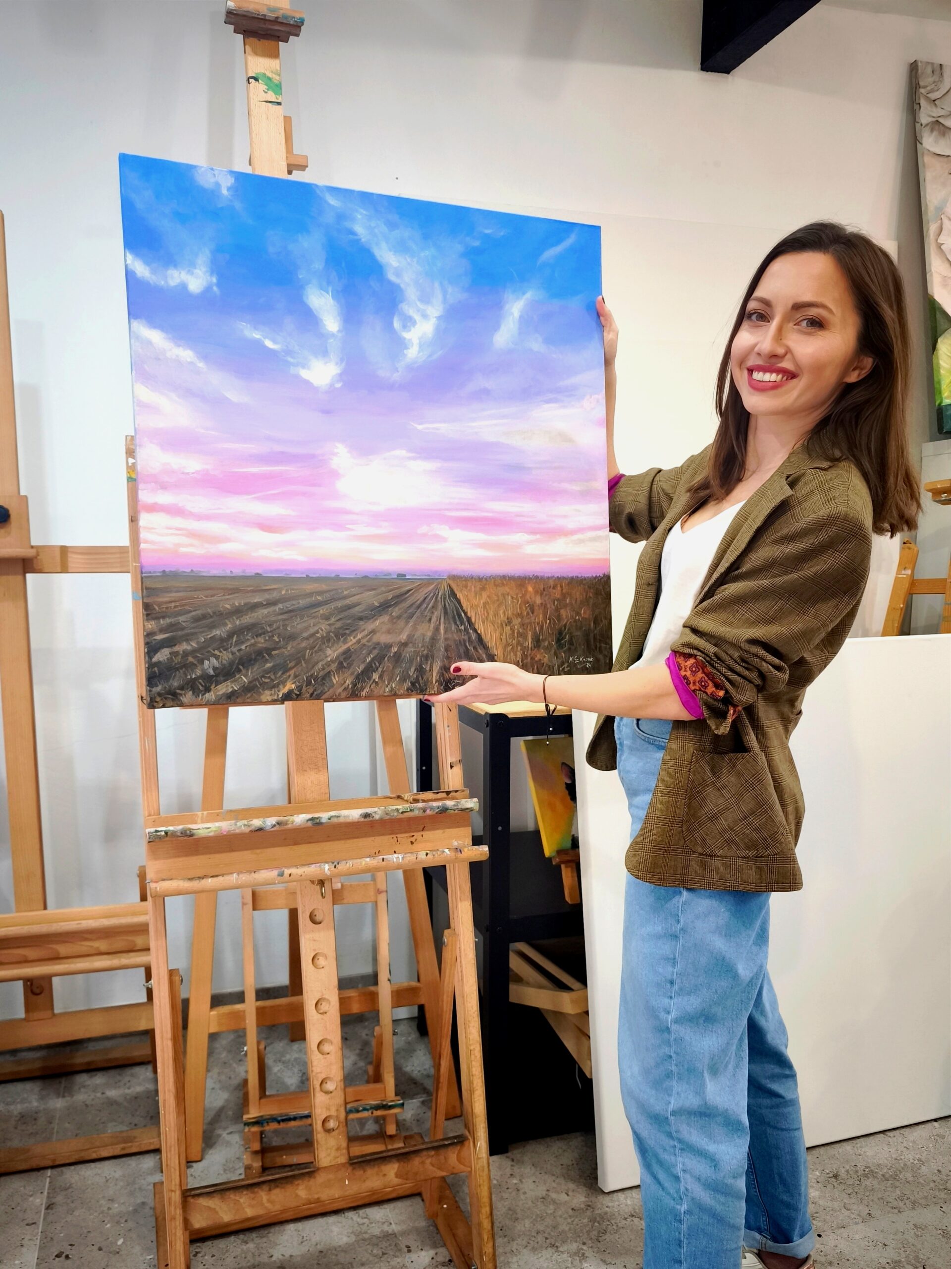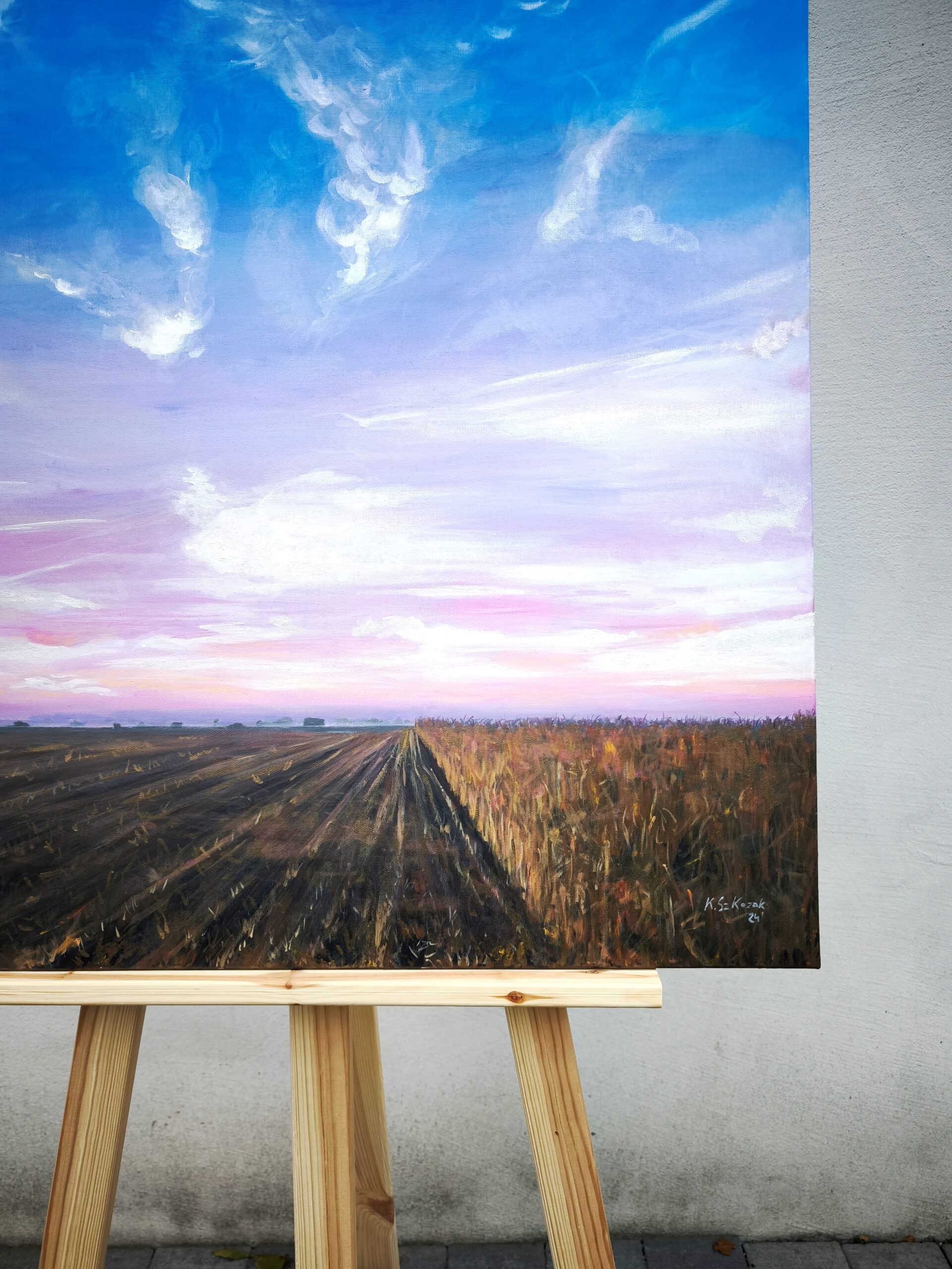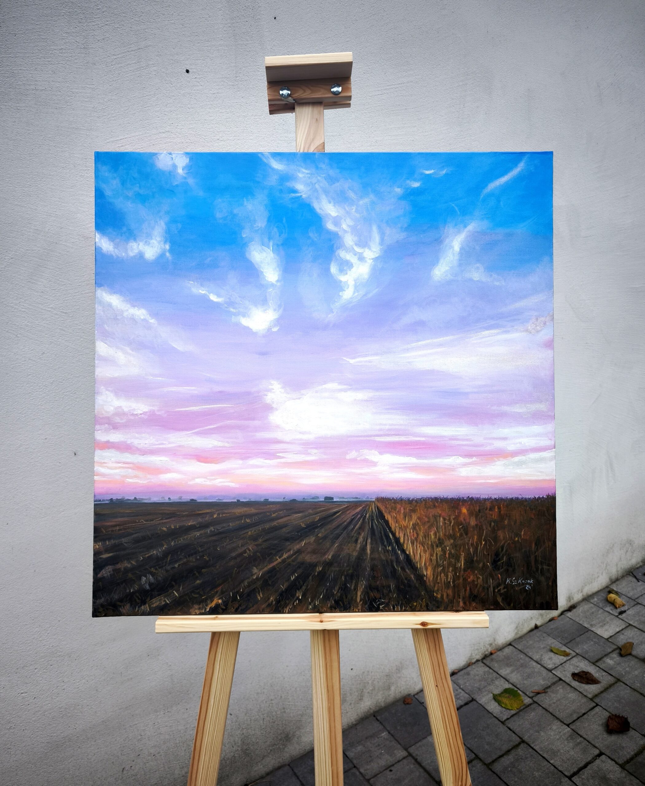 Obraz ten przedstawia moje rodzinne strony i widoki, które mam okazję oglądać prawie każdego dnia. Z uważnością obserwuje, jak zmieniają go pory dnia, roku oraz pogoda. Niebieskości, fiolety i brązy uzupełniłam świetlistymi i białymi elementami. Chmury jak zwykle przykuwają moją uwagę. Uwielbiam obserwować jak każdego codziennie niebo wygląda zupełnie inaczej. Nietuzinkowy pejzaż, który wprowadzi odrobinę koloru i element dekoracji we wnętrzu.