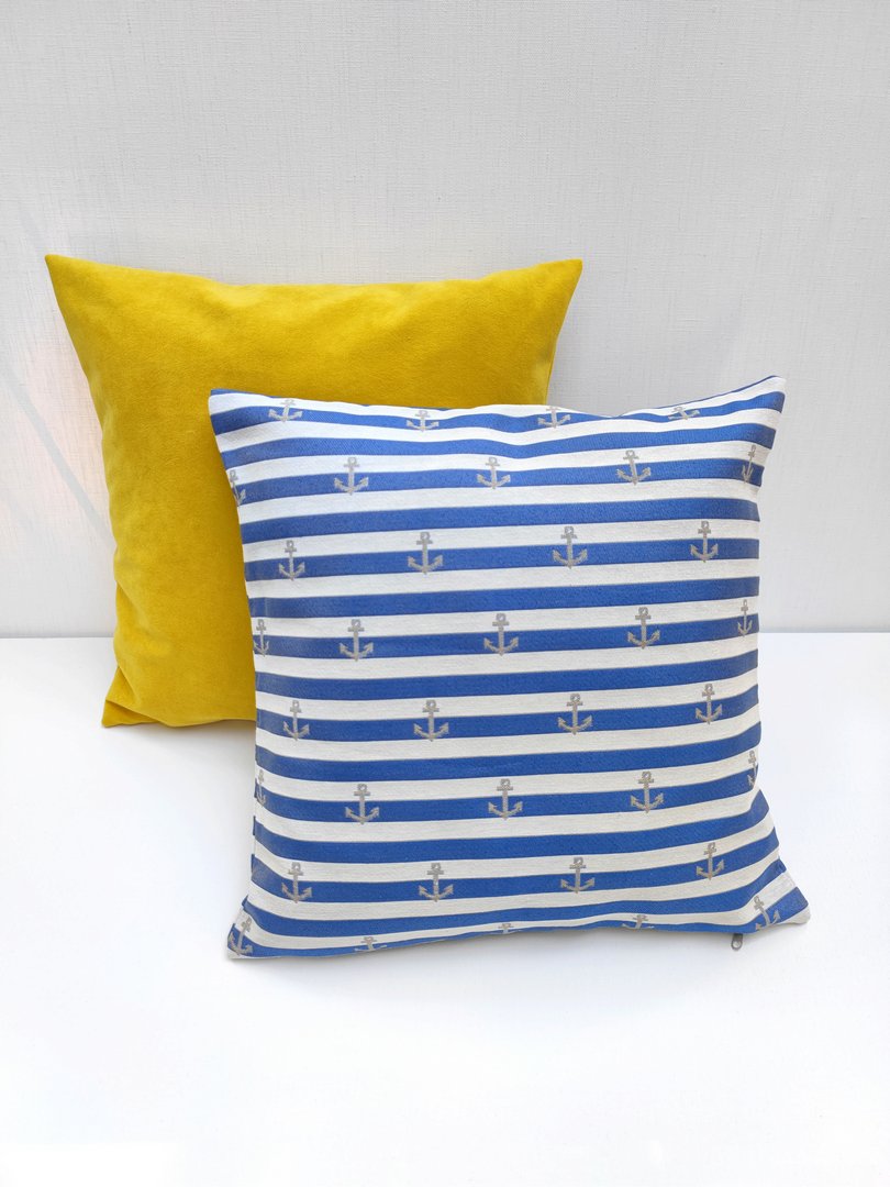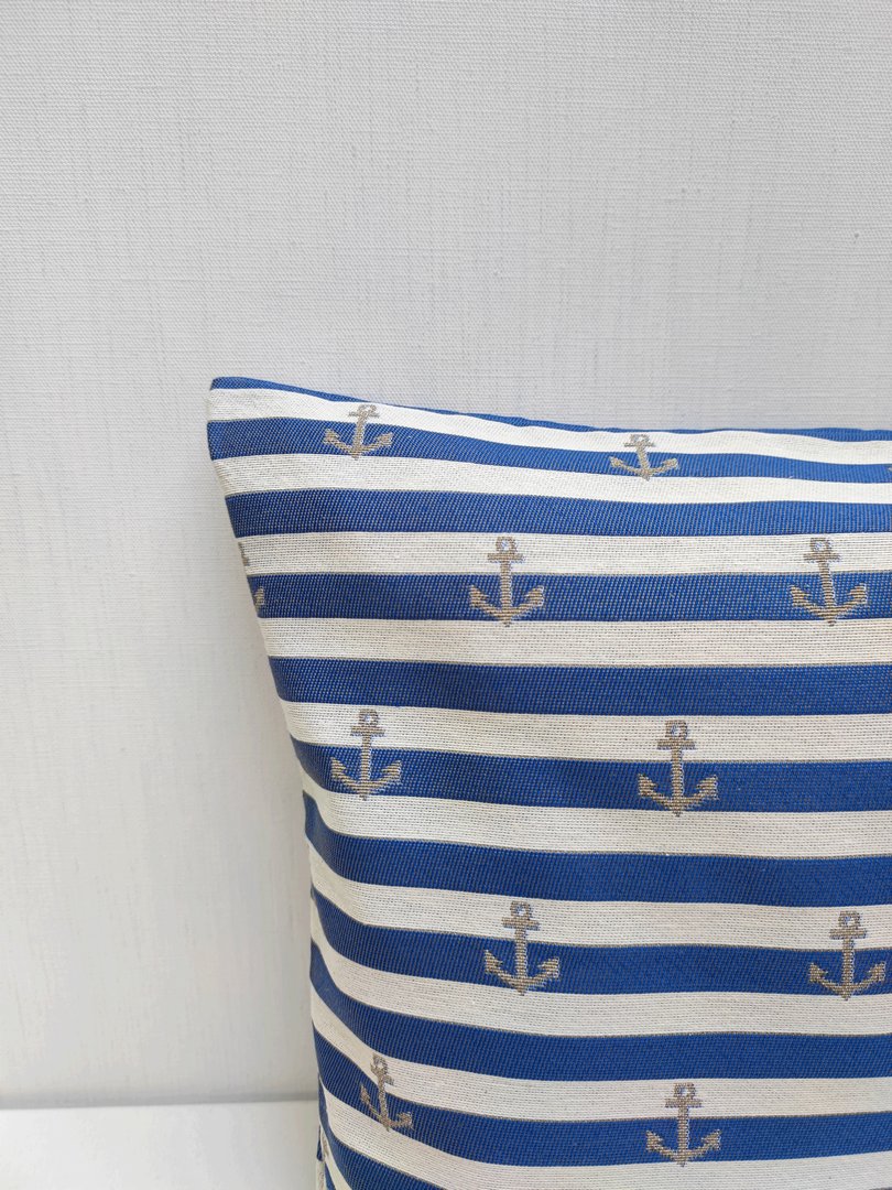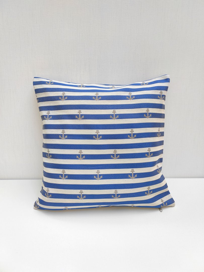 Pasiasta poszewka wykonana z wzorzystej tkaniny. Kolory które dominują to niebieski oraz ecru, a dodatkowym elementem dekoracyjnym jest kotwica. Poszewka posiada wszyty zamek błyskawiczny. Świetnie dopełni wystrój wnętrza, zwłaszcza wielbicieli nadmorskich klimatów. Produkt w całości uszyto w Polsce. Wkład do poduszki sprzedawany jest osobno.